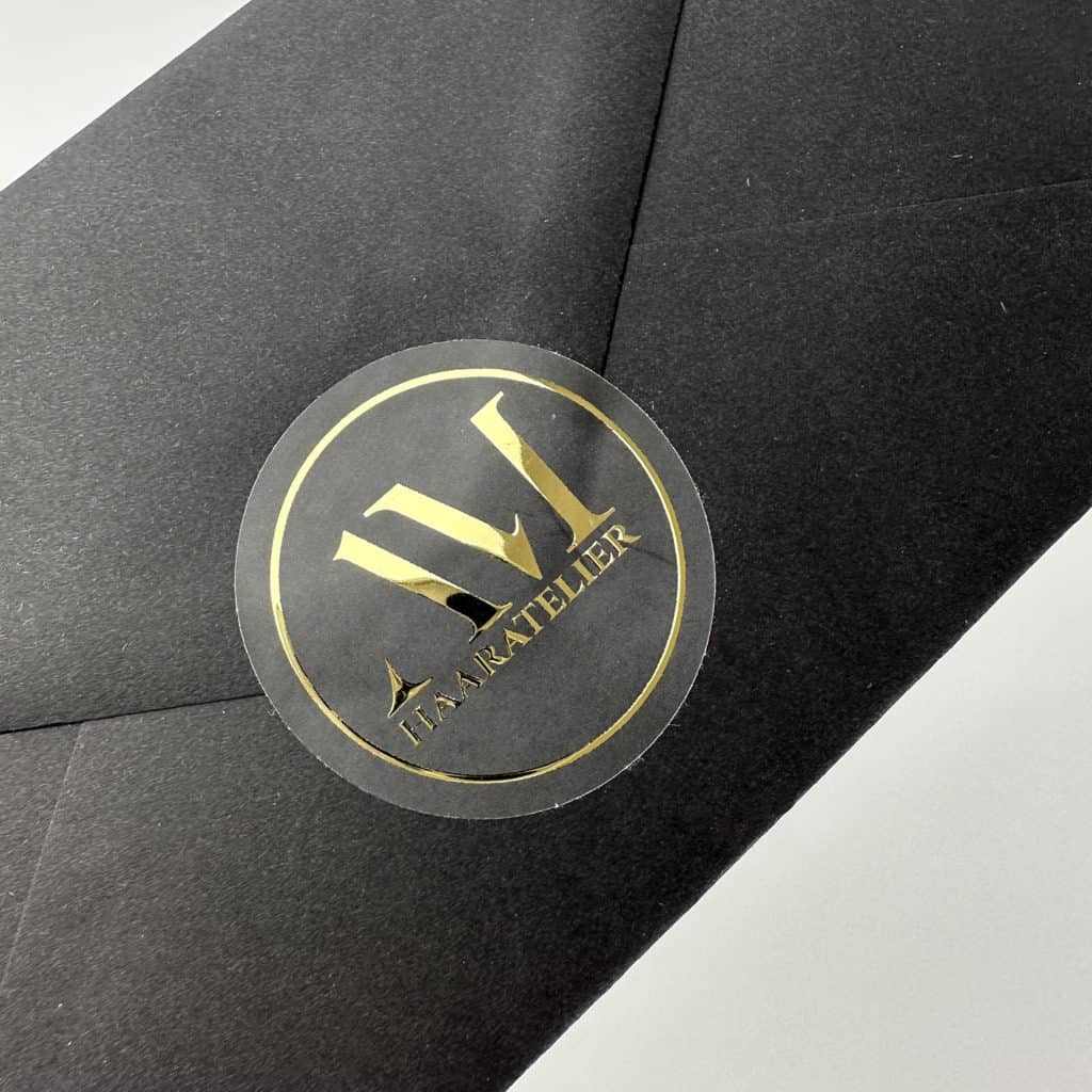 Aufkleber in deinem individuellen und luxuriösen Design – VEREDELUNG MIT HOCHGLANZ GOLD – ideal für Pakete, Gutscheine, Produkte oder Einladungen oder Danksagungen.