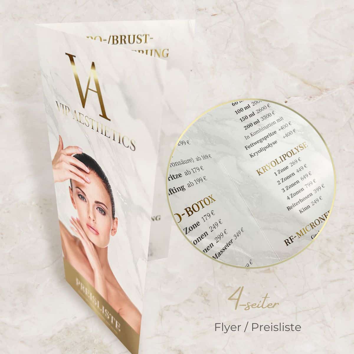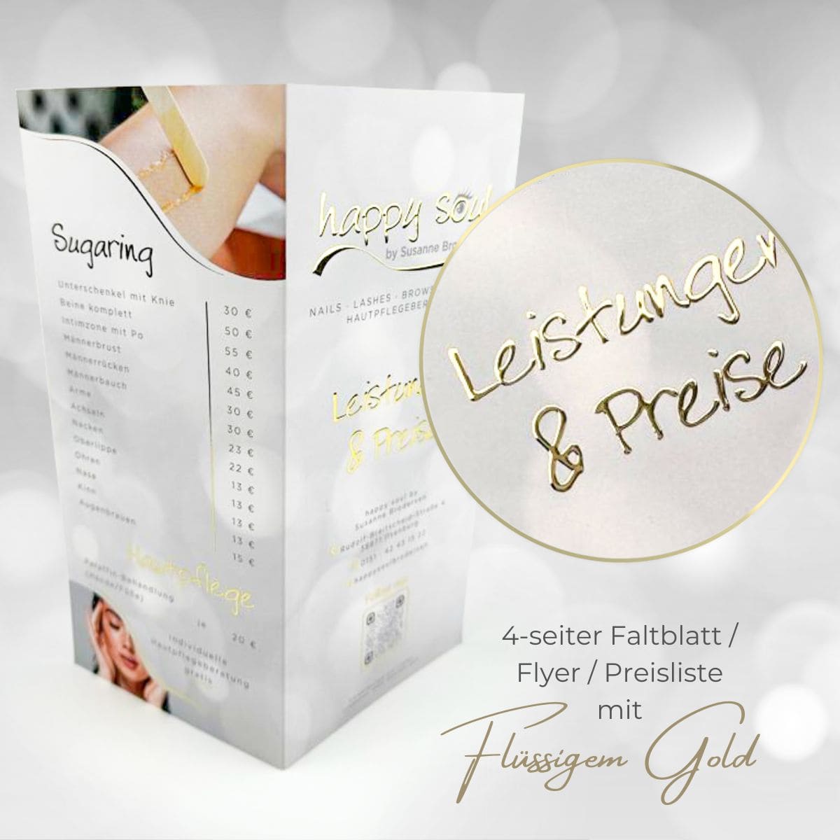 Verteile potentiellen Neukunden dieses exklusive Faltblatt mit flüssiger Gold- oder flüssiger Silber-Veredelung und mache sie bereits mit diesem edlen Handout glücklich. Ob es sich bei dir um einen 4-Seiter Flyer für Kosmetik, deine PMU Behandlungen, die Pediküre, die Zahnaufhellung oder andere Beautyanwendungen handelt, deine Kunden werden von dem individuellen Design und der erstklassigen Qualität schon direkt begeistert sein.