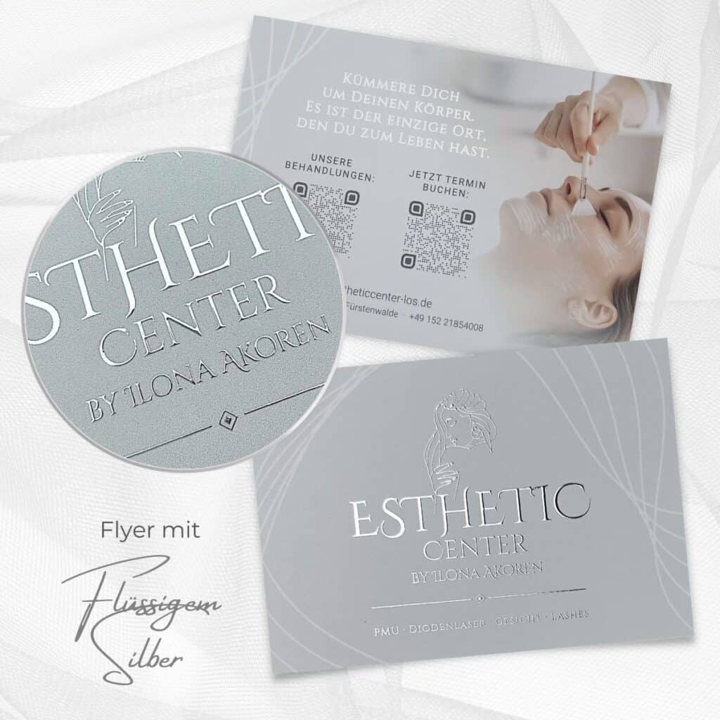 Verteile potentiellen Neukunden diesen exklusiven Flyer mit flüssiger Gold- oder flüssiger Silber-Veredelung und mache sie bereits mit diesem edlen Handout glücklich. Ob es sich bei dir um einen Flyer für Kosmetik, deine PMU Behandlungen, die Pediküre, die Zahnaufhellung oder andere Beautyanwendungen handelt, deine Kunden werden von dem individuellen Design und der erstklassigen Qualität schon direkt begeistert sein.