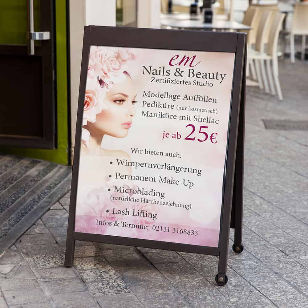 Um mit deiner Werbebotschaft in kurzer Zeit möglichst viele Menschen ansprechen zu können, sind Plakate das geeignete Werbemittel. Gerade in der Beautybranche, die von Glanz und Glamour lebt, sind auffallende Hingucker besonders von Vorteil. Mit uns an deiner Seite bist du bestens aufgestellt, wenn es darum geht, dich zum Hingucker zu machen. Nutze daher die Hochglanzoptik, um deine exklusiven Angebote für Effekt Kosmetik oder Hautberatung zu vermarkten.