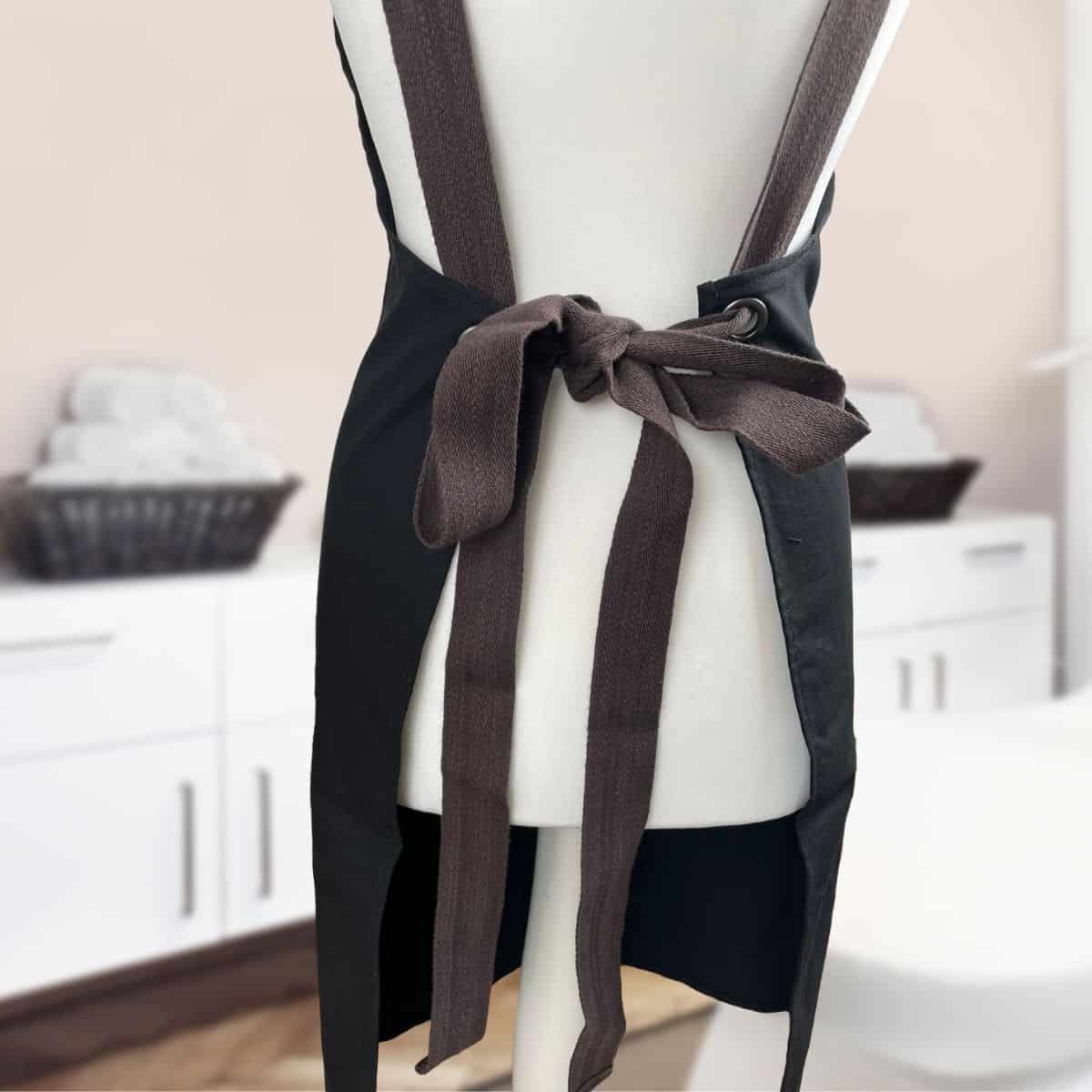 Die Schürze wird hinten mit einer Schleife gebunden und besitzen vorne eine Tasche.