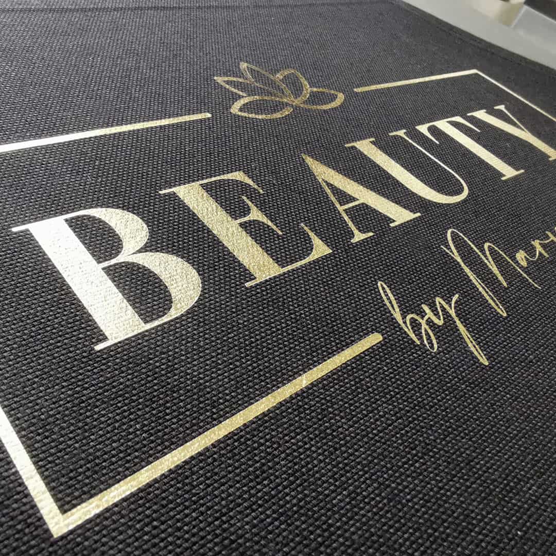 Hochwertige schwarze Canvas (280g Qualität !!!) Schürze – veredelt mit deinem Logo in Glanzgold / Glanzgold weiß – in Einheitsgröße (Größe ca.: H 90 cm x L 76 cm)